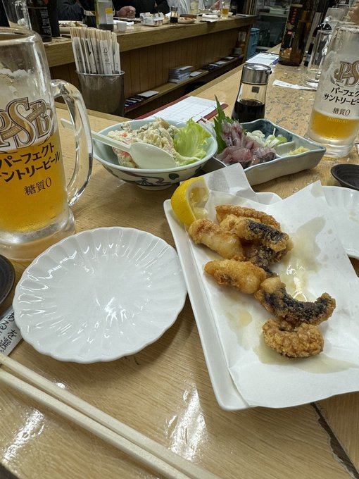 こないだの都現美の帰りに、大衆酒場の名店「だるま」に連れてってもらった。コの字カウンター!タコ唐、ポテサラ、鯵の刺身、つまみはどれも美味しい。最高ー。 pic.twitter.com/Okd8ktAdyA